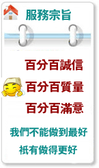 百分百诚信、百分百质量、百分百满意,我们不能做到最好,只有做得更好!