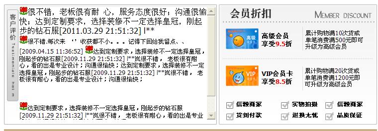 今日分享一款很棒的淘宝店铺装修免费模板:含淘宝买家评价和会员折扣的实用淘宝右侧自定义模块模板代码。下面是其预览截图: