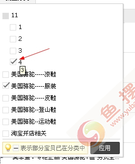 (4)勾选需要放入的分类目录,然后点应用即可完成淘宝宝贝商品的批量分类(归类)工作。