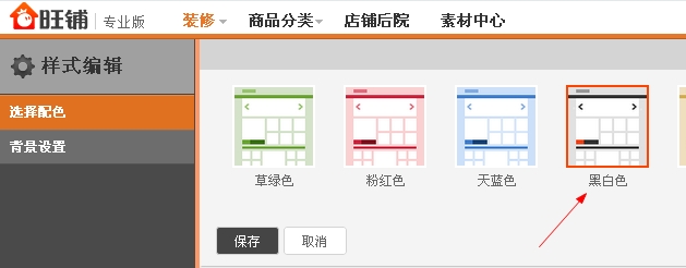 鼠标移动到装修后台左上角的“装修”按钮上,单击“样式编辑”,选择系统配色为“黑白色”