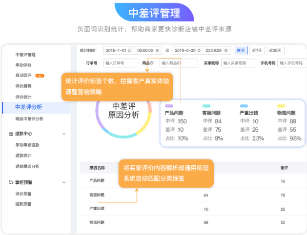 对客户舆情监督分析,识别统计负面词,能帮助商家更快诊断店铺中差评来源;针对店铺中差评询问解释/道歉,对客户进行安抚,全面提高店铺DSR评分。