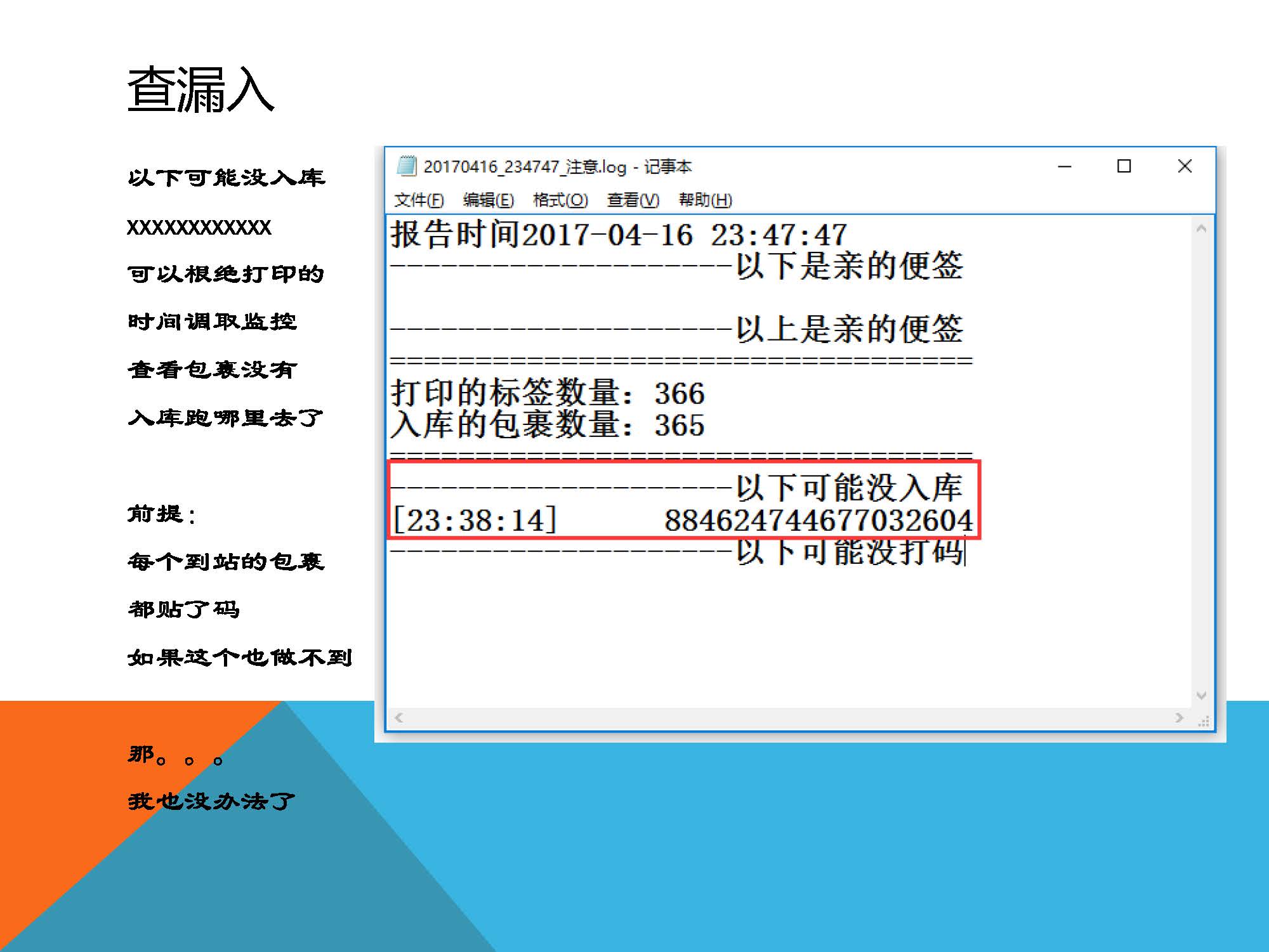 哈哈,哥们挺有才的呀,不过我还是感觉每个包裹都贴号的话还不如直接把号贴在货架上,只贴一次号,来了包裹直接对号入座,也不用写号也不用贴号也不用管面单朝哪,怎么放省地就怎么放,出库的时候对号拿就行,号就在货架上贴着不动,稍微熟练点的一看号就知道在哪放着基本不用找
