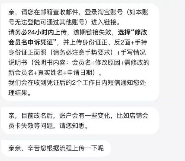 根据该网友与客服的聊天记录,用户提出改会员名要求后,客服给出了修改链接,并要求上传身份证照片和手持身份证的正面照,以及情况说明书。